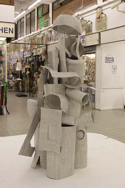 During a three months residency I was working along side the artists Judy Hockley and Jo Wallace in Castle Market using some designated stall spaces as our studios. The papier-mâché shapes were inspired by the history of Castle Market, that sits on the remains of Sheffield Castle going back to about 1100. The stalls became my studio where I was working and talking to market visitors. The fact that I was in the market visitor’s space it seemed easy for people to come up and start a conversation. We also had some regulars who frequently checked on progress. The residency was celebrated with ‘Closing Event’.